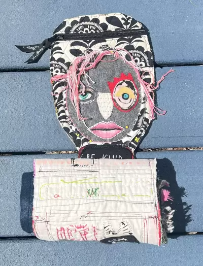 This class begins with a face. We’ll start by creating the spirit of our figure—using abstract elements we will be hand stitching a face that feels like someone waiting to be known. From there, we’ll begin building her form in a series of connected fabric sections, allowing the piece to grow in an intuitive and layered way. Fabric becomes our language. Through hand stitching, painted details, and simple surface design techniques, we’ll create a small sequence of story-filled segments that extend from the face—forming the beginning of a rollable figure that can be continued long after class ends. This is a piece that holds both the visible and the hidden. You may choose to include a symbolic detail, a quiet mark, or something personal stitched into your layers. Each addition becomes part of her story—whether shared or kept just for you. Along the way, we’ll explore:-creating expressive faces using mixed media and/or stitch-building a soft, flexible structure in connected sections- simple fabric surface design techniques- hand stitching as both mark-making and connection- working intuitively without overthinking My roll- up class sample measures 42” By the end of class, you’ll have a completed face and the beginning of a layered, roll-up figure—along with the tools and inspiration to continue growing your piece at home. All experience levels are welcome. Gently… we’ll let her begin
