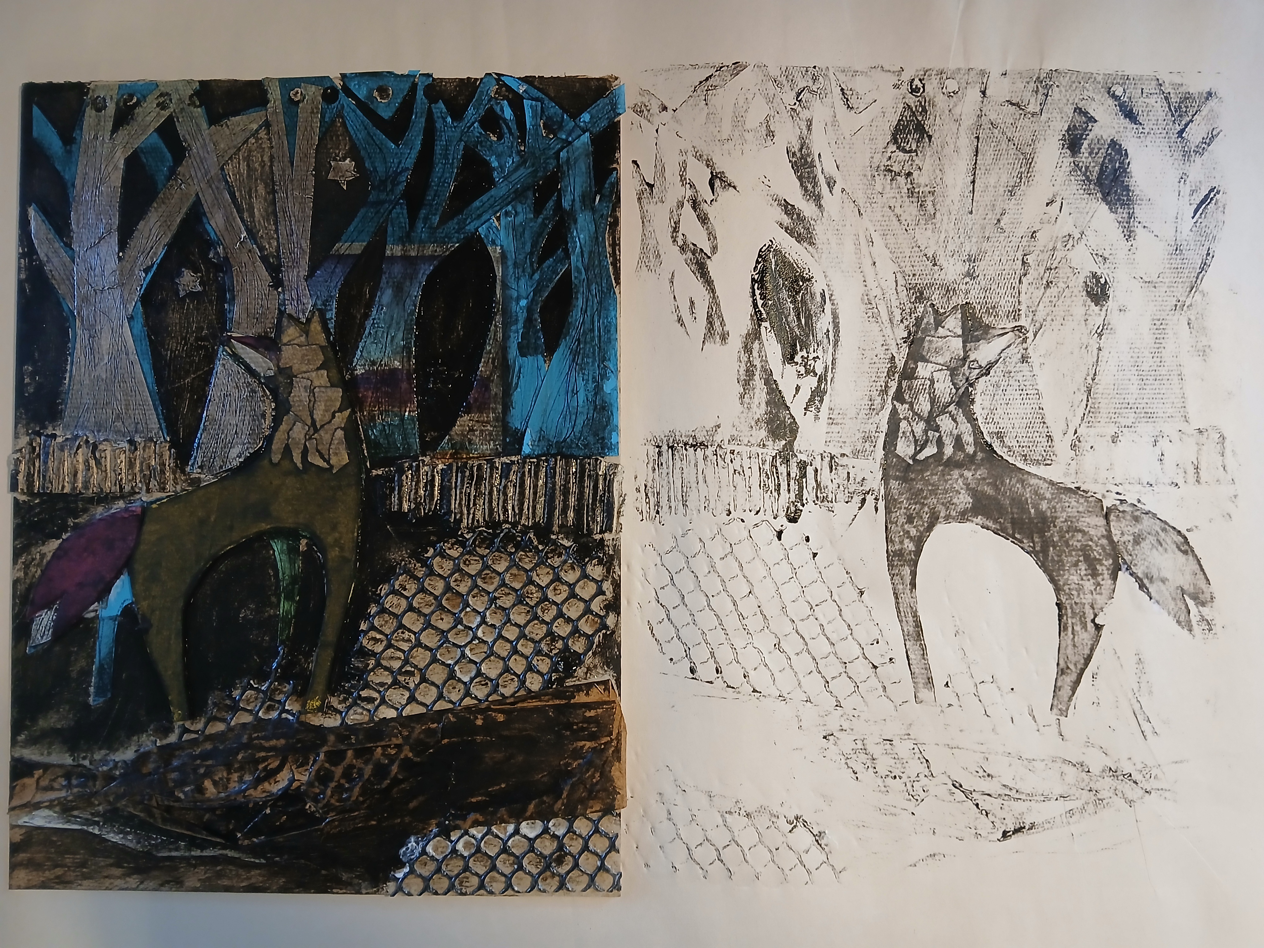 A collagraph is a handmade relief printing plate constructed by collaging cardboard and other flat or textured materials together using PVA glue. We’ll use cardboard, a variety of tapes, vinyl, aluminum, plastics, and other recycled materials to create the relief plate. Then we’ll print multiple prints using different inks, and papers for printing. We will achieve varied results using techniques such as wiping, masking, and layering colors to create one of a kind monoprints each time we ink the plate and produce a print. We will talk about preserving our relief plates using varnish to extend the life of the collagraph plate for use at home. You will leave with multiple prints of your own design using the collagraph relief plate that you construct during class.